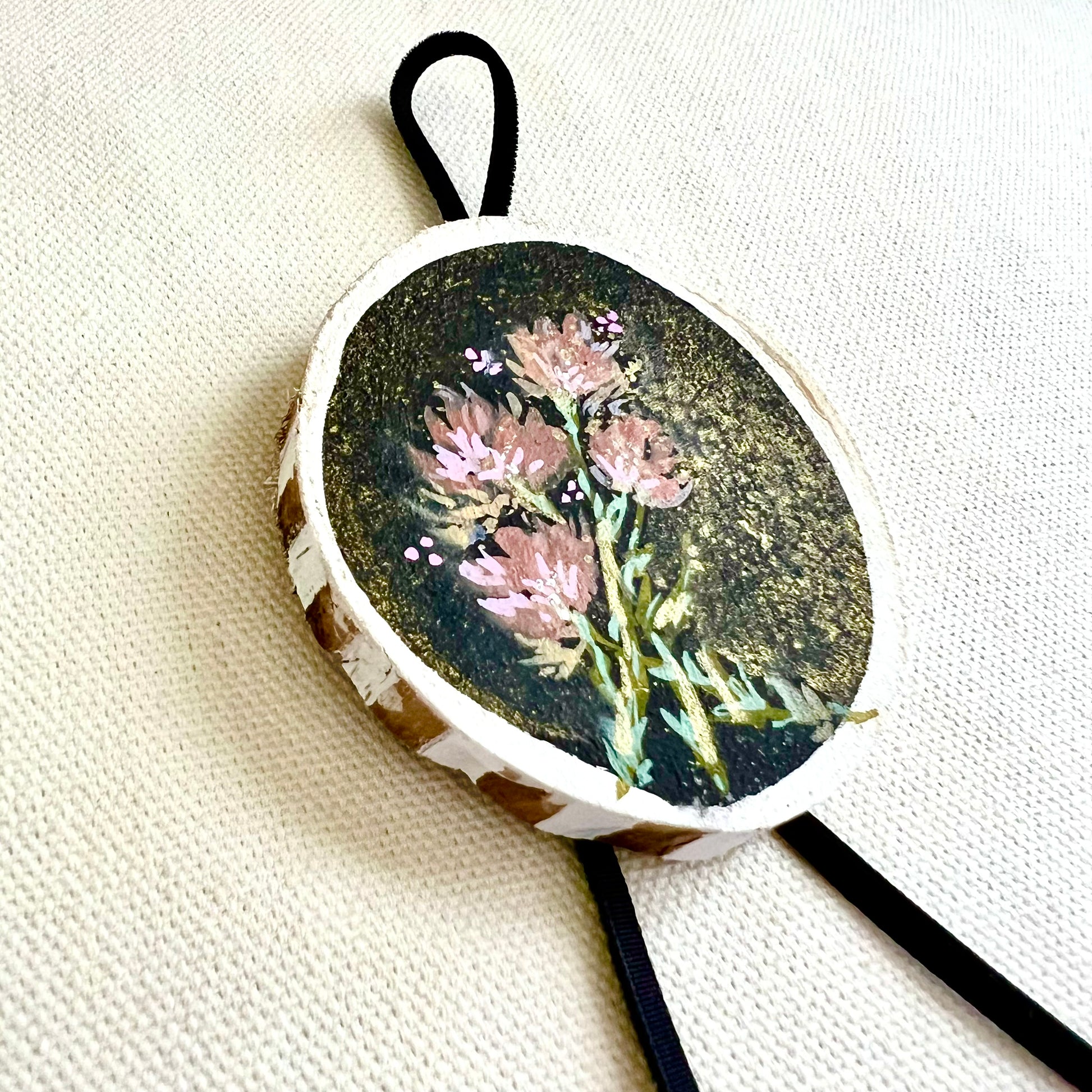 This beautiful ornament is one of a kind, hand painted on wood with a vintage style velvet ribbon and shimmery gold partials! Signed and ready to hang! Includes a gift bag for easy gifting or storing for yourself.