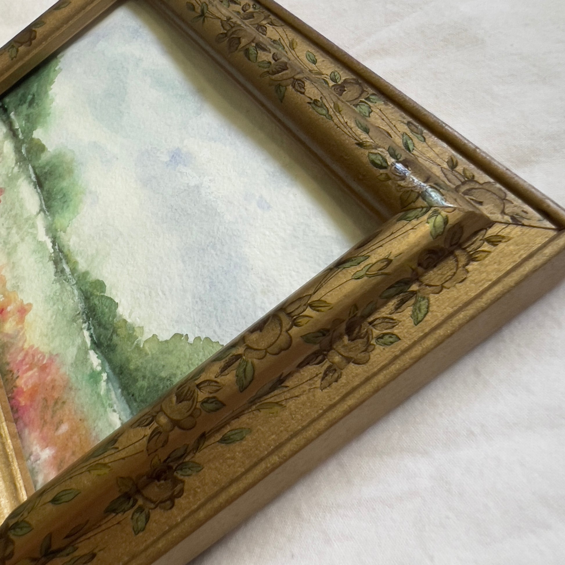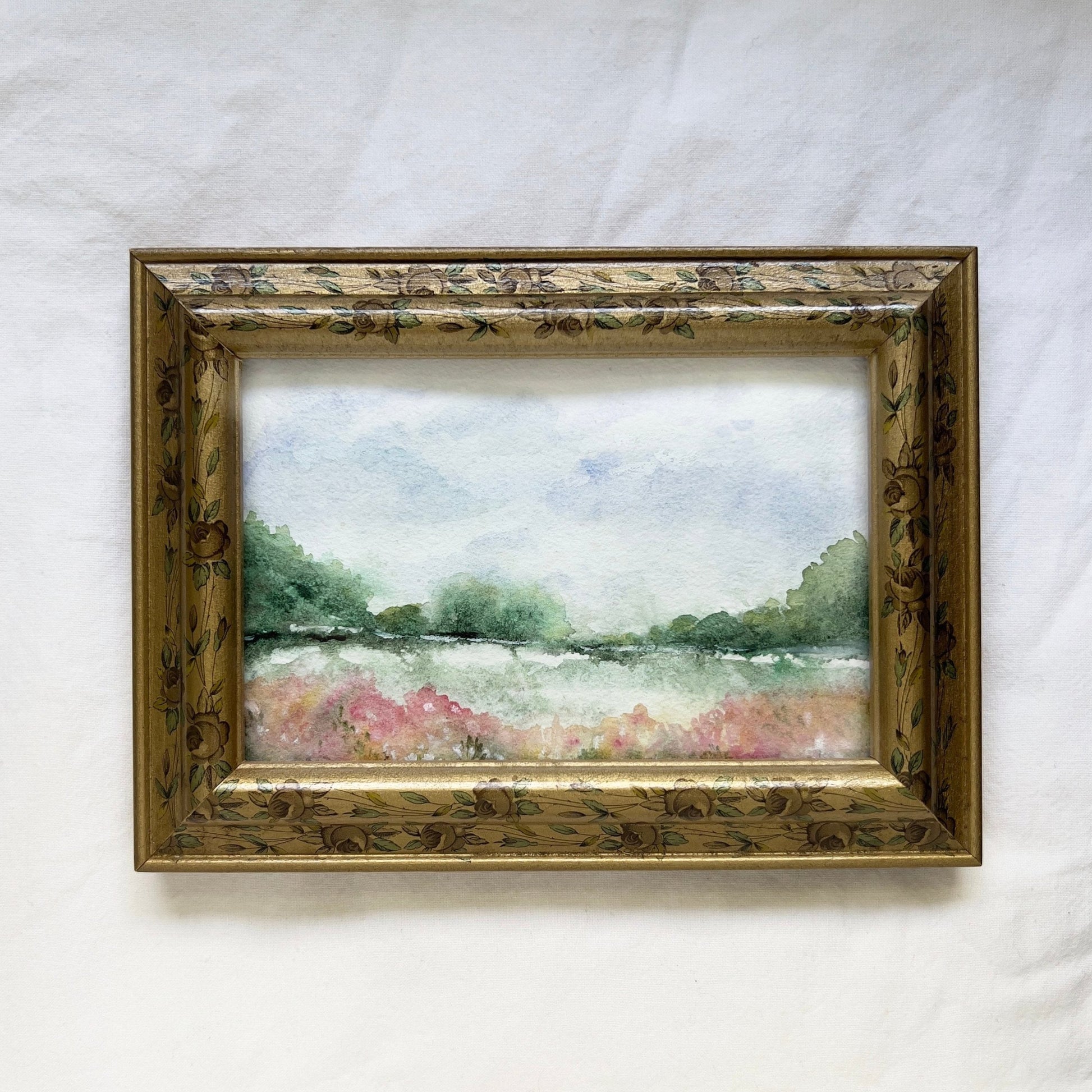 Experience the tranquil beauty of Poppy Fields. This one-of-a-kind piece is a loose watercolor painting, carefully crafted by hand and encased in a hand painted (with tiny rosettes!) antique frame. Bring a peaceful touch of nature into your home.