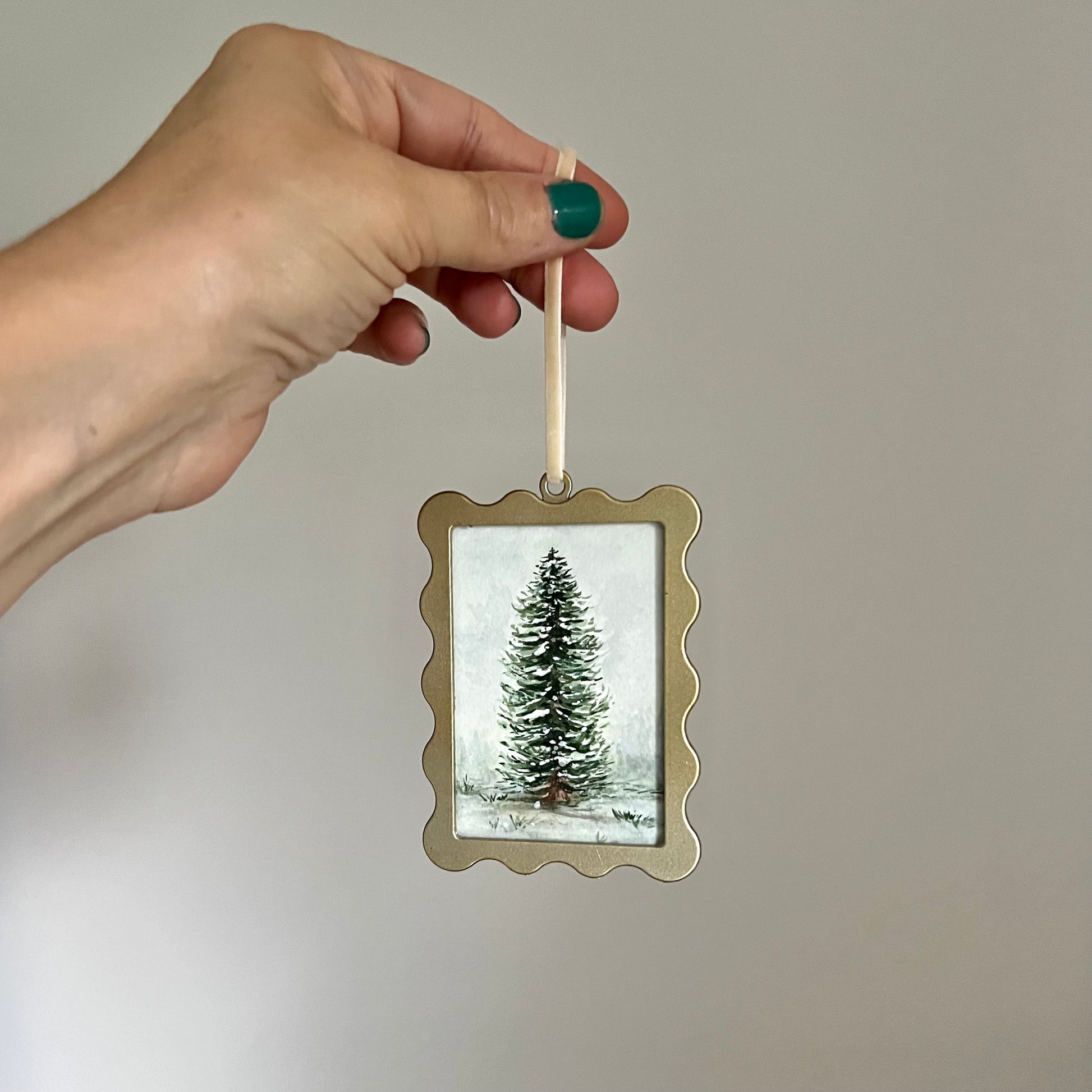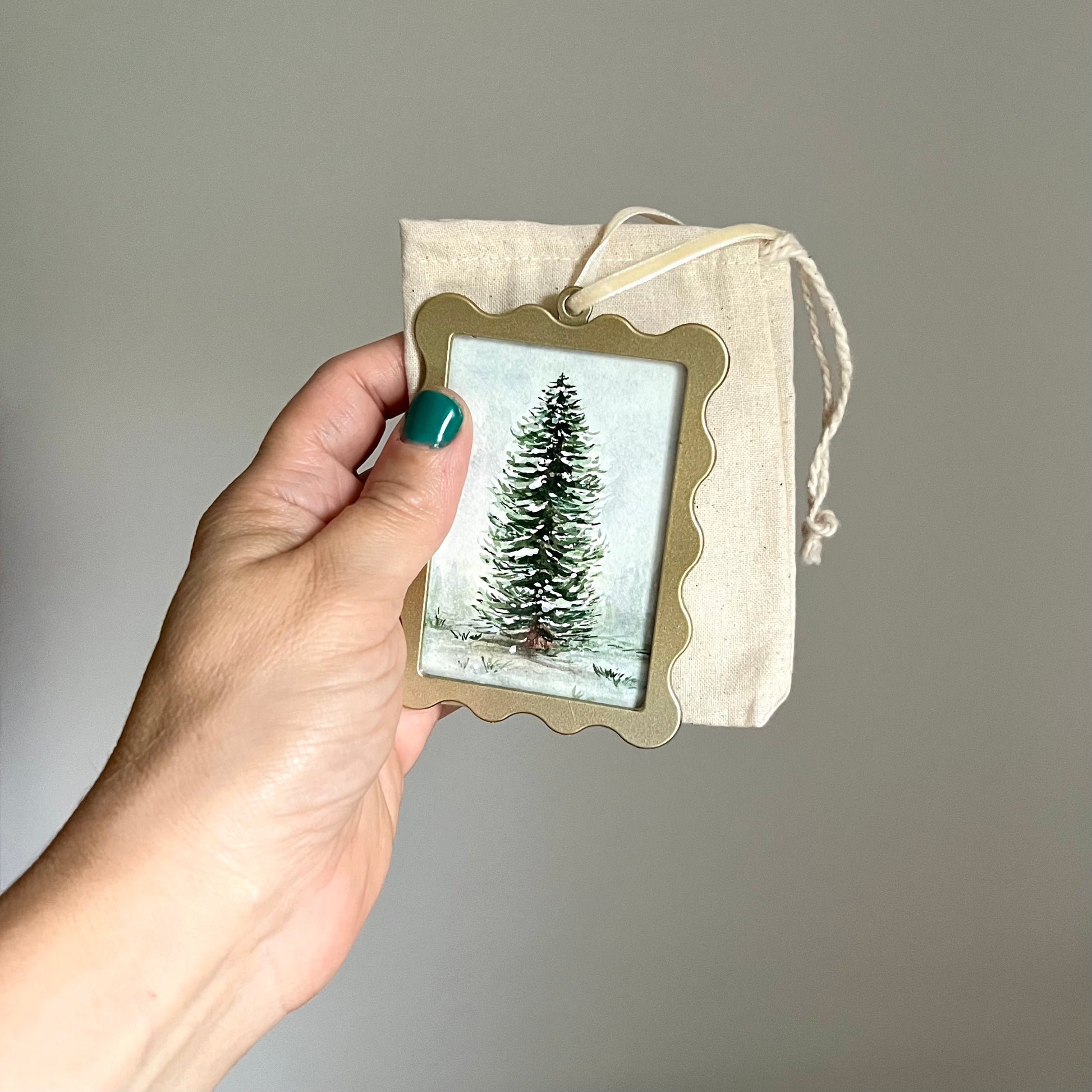 This beautiful ornament is hand painted showcasing a winter scene evergreen tree behind glass in a gold metal frame. Signed and ready to hang! Includes a gift bag for easy gifting or storing for yourself.