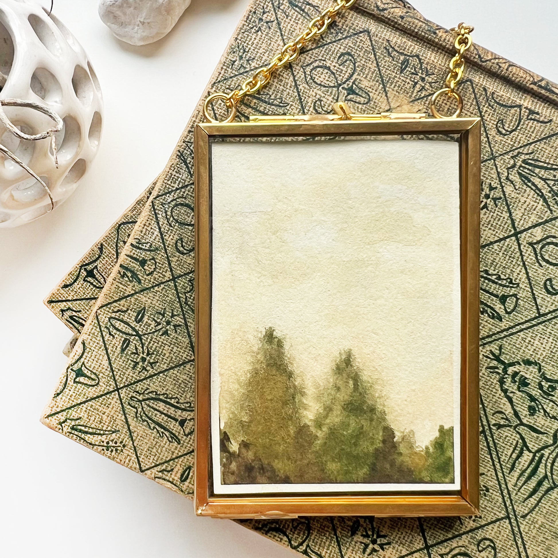 One of a kind, original hand painted watercolor on ivory watercolor paper. Artwork is displayed in our lovely brass mini floating frames! Great to add to a gallery wall of varies size pieces or alone.