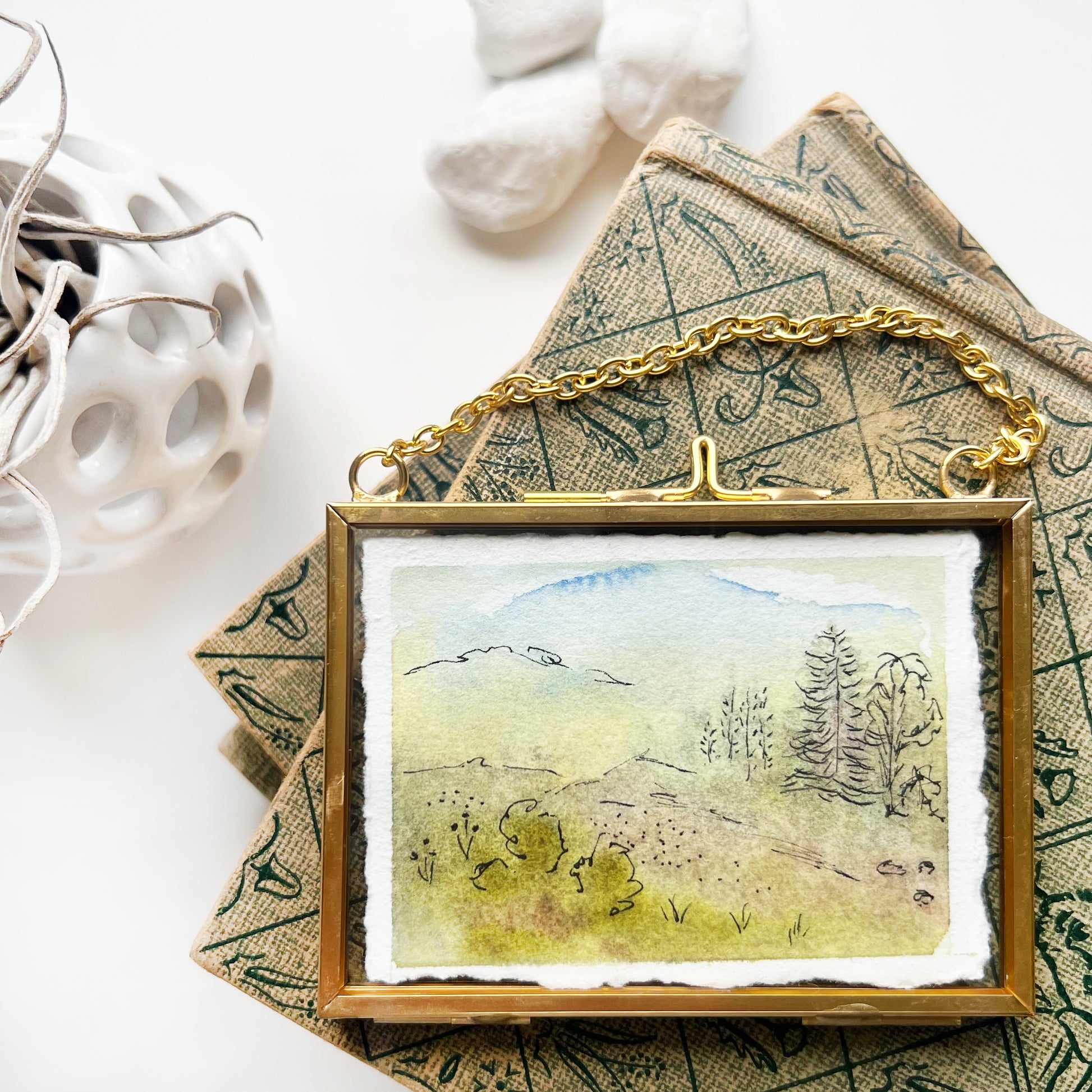 One of a kind, original hand painted, hand deckled edge watercolor on white watercolor paper with added hand drawn details. Artwork is displayed in our lovely brass mini floating frames! Great to add to a gallery wall of varies size pieces or alone.