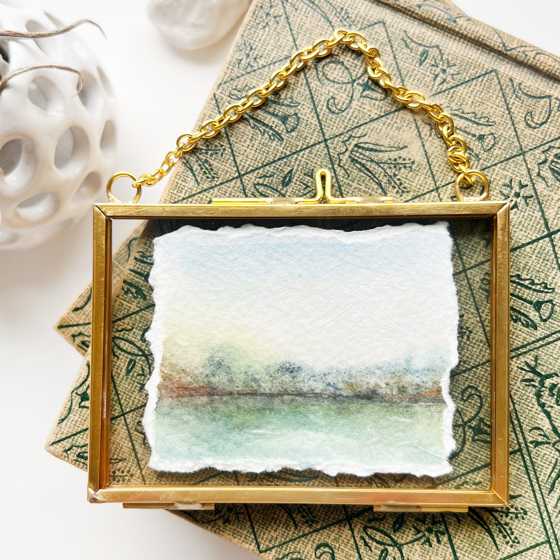 One of a kind, original hand painted, hand deckled edge watercolor on white watercolor paper. Artwork is displayed in our lovely brass mini floating frames! Great to add to a gallery wall of varies size pieces or alone.