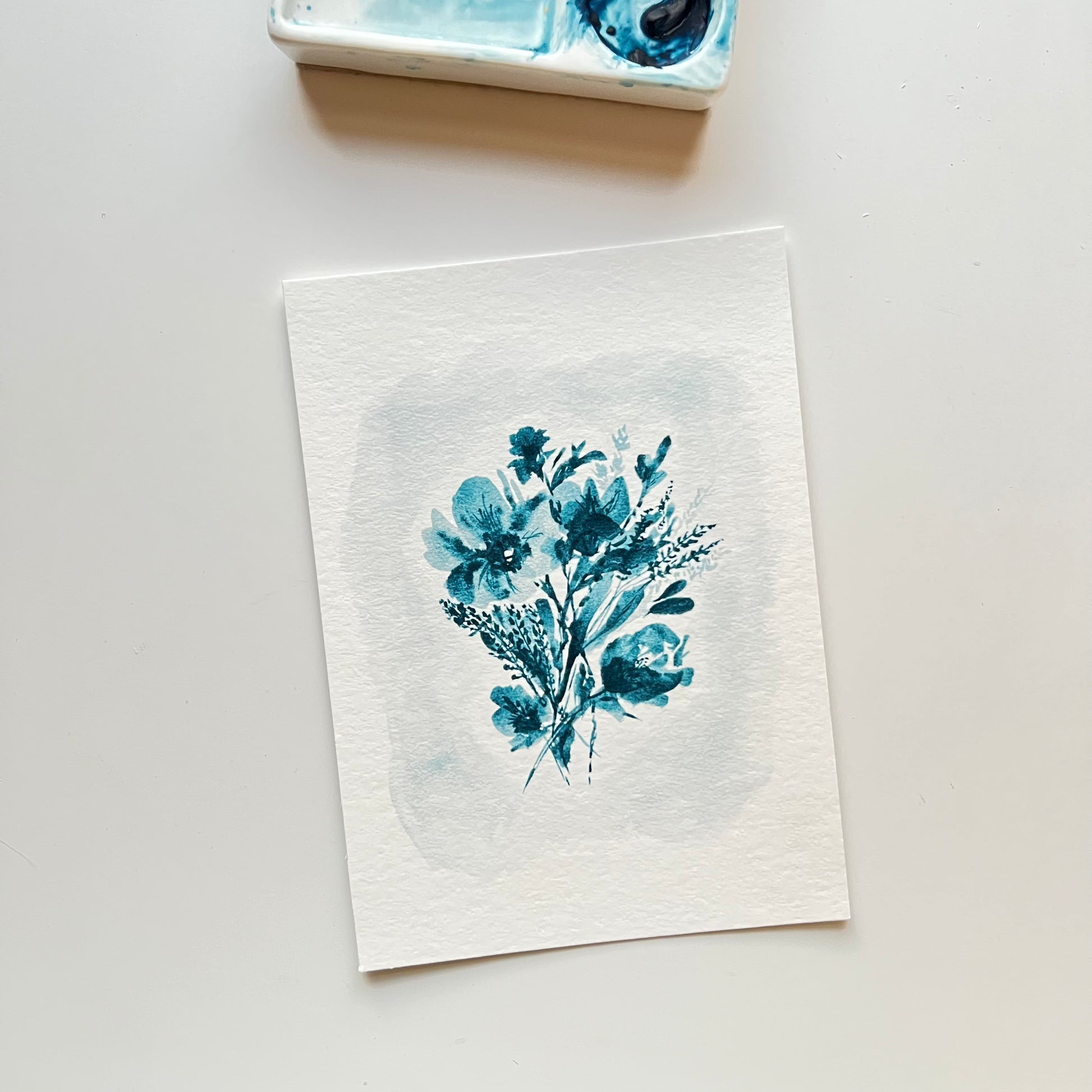 My Mayan Blue collection features a single pigment watercolor. The process of creating light and dark tones was difficult but taught me valuable lessons. The end result is truly lovely, with a peaceful and soothing blue-green hue that will bring tranquility to any environment.