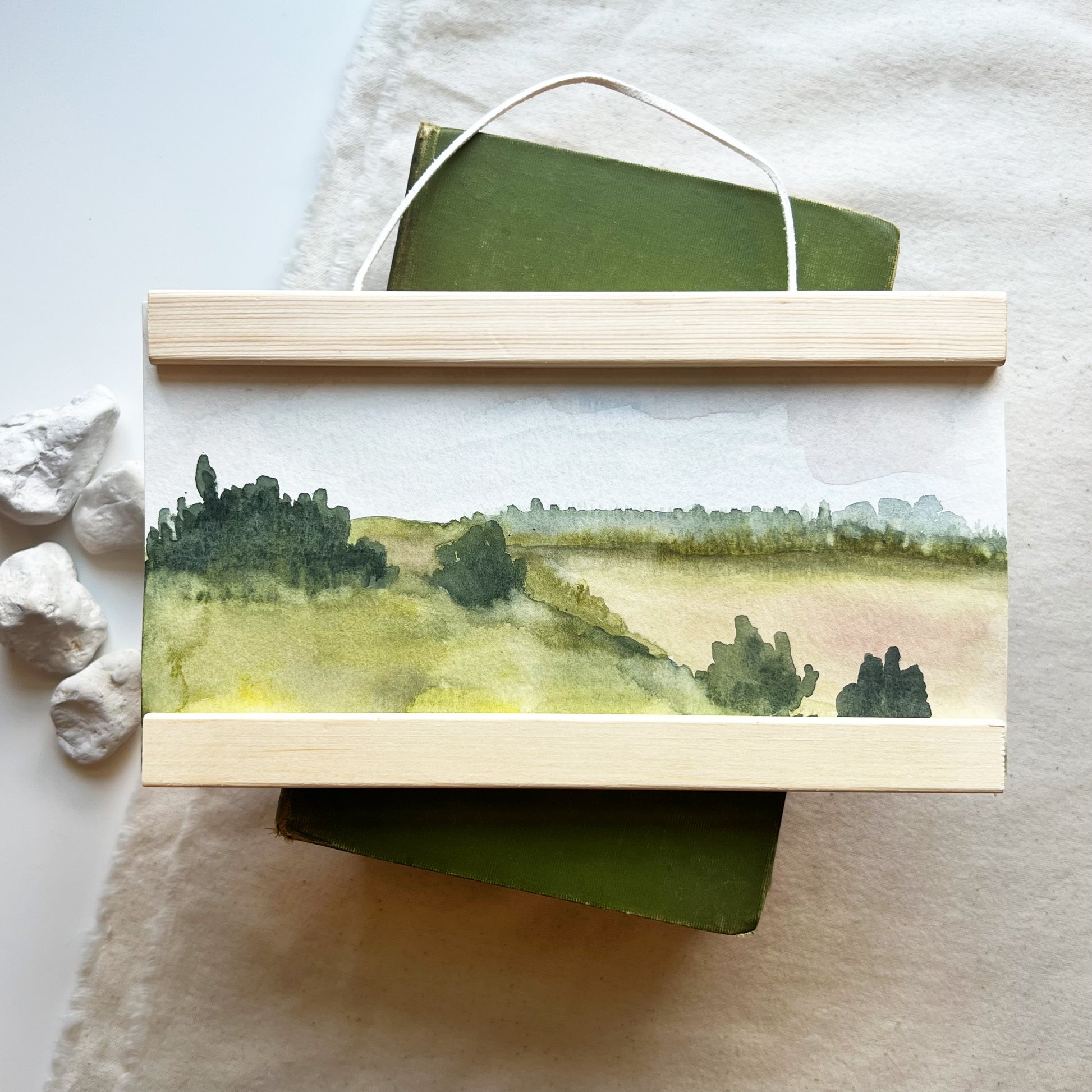 This unique piece is hung with a magnetic wood frame for a modern look. Framing my original soft watercolor landscape painting on watercolor paper.