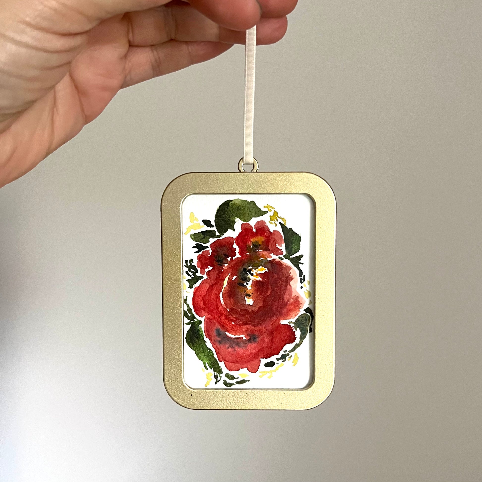 This beautiful ornament is hand painted showcasing a deep red floral behind glass in a gold metal frame. Signed and ready to hang! Includes a gift bag for easy gifting or storing for yourself.