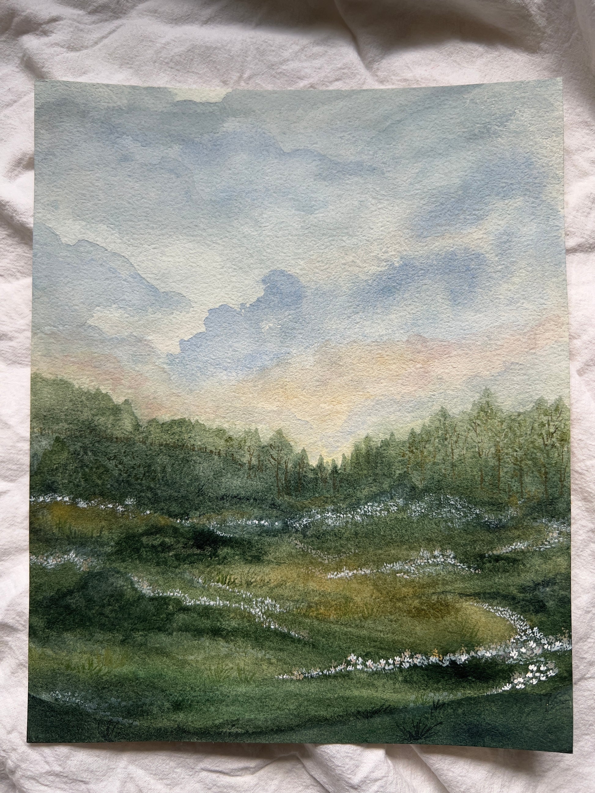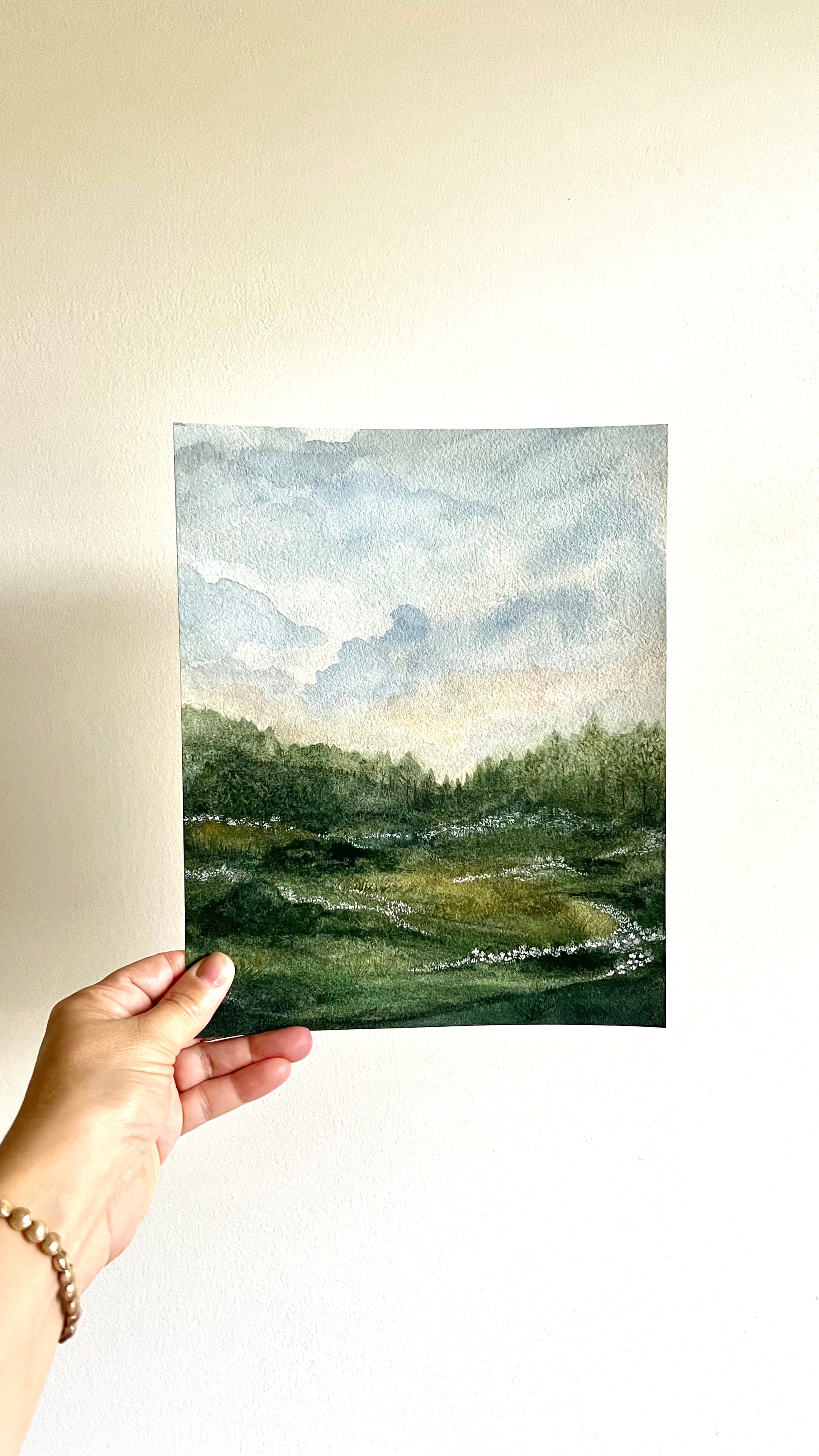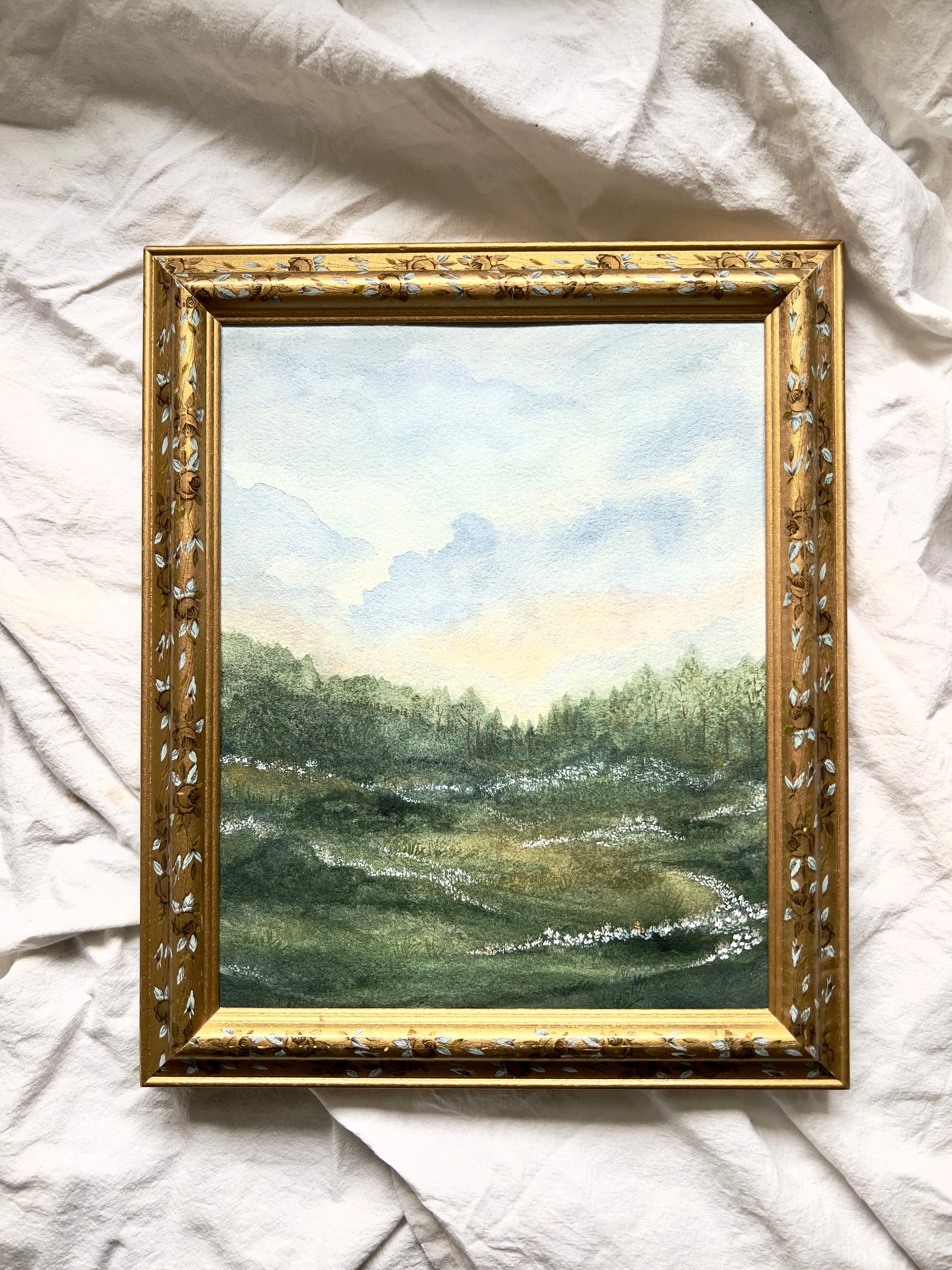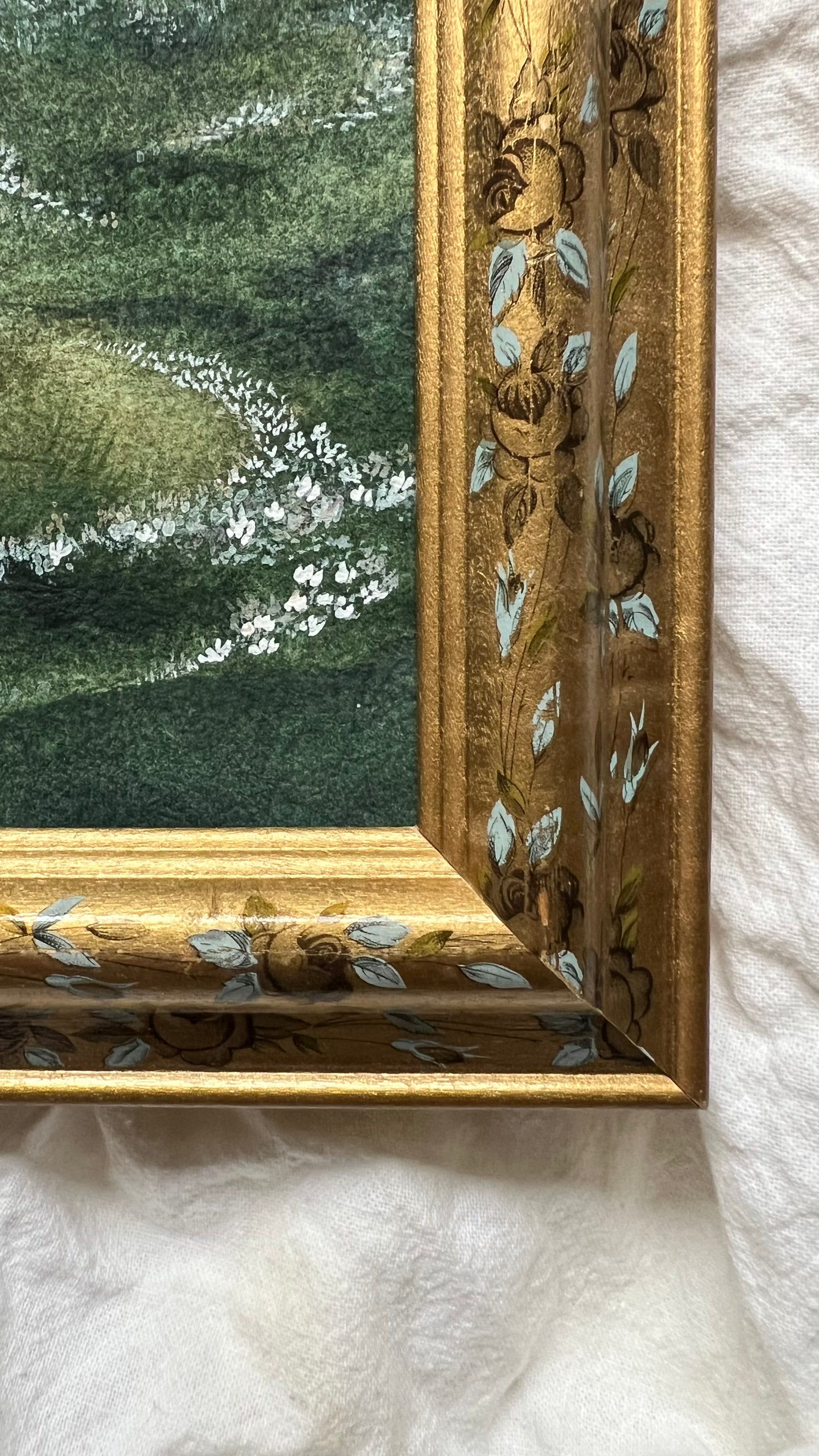 Experience tranquility with Psalm 23 - a stunning hand painted watercolor painting inspired by the calming words of the scripture. The antique frame with light blue rosettes adds a touch of elegance to this piece, reminding you to find rest and peace in the Lord who is your shepherd and provides for all your needs.