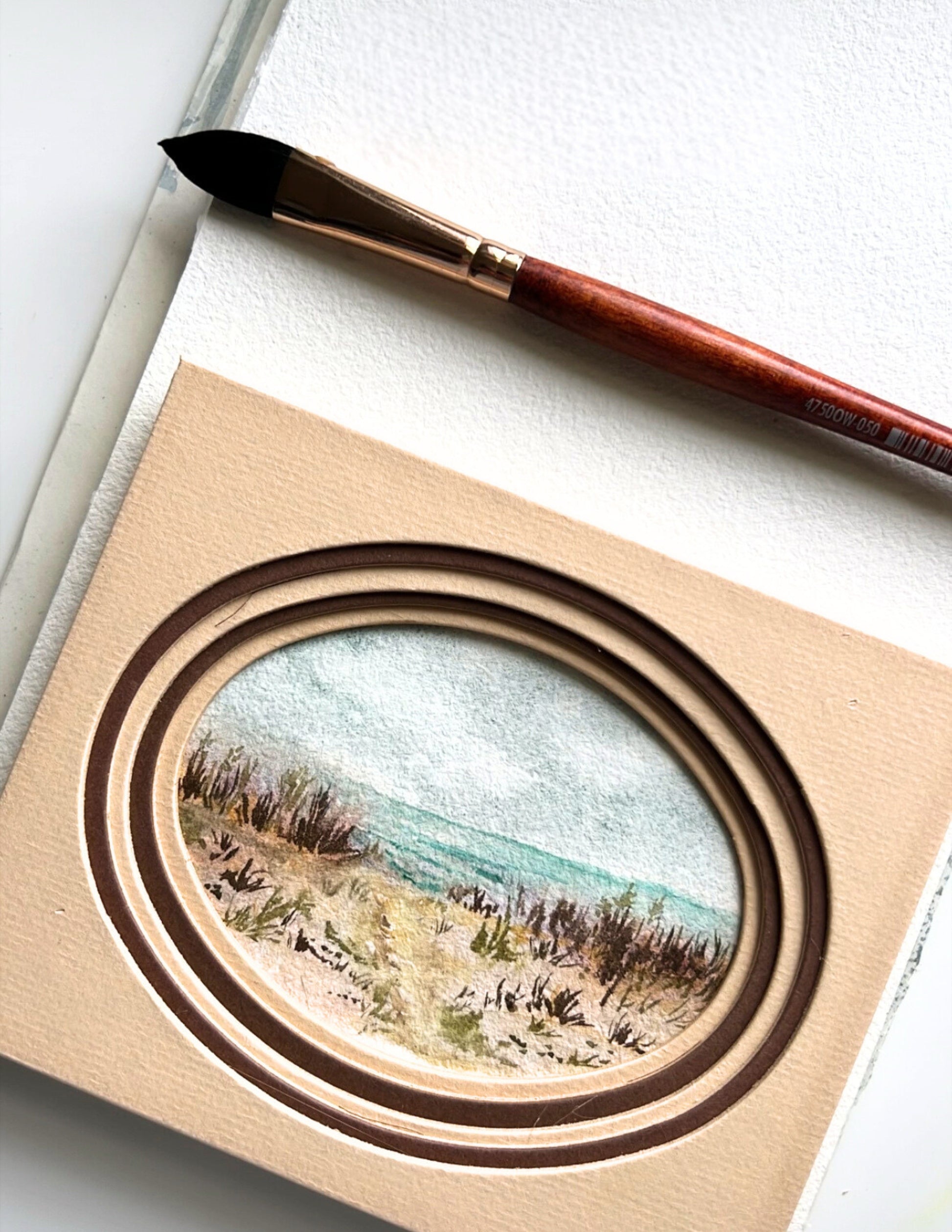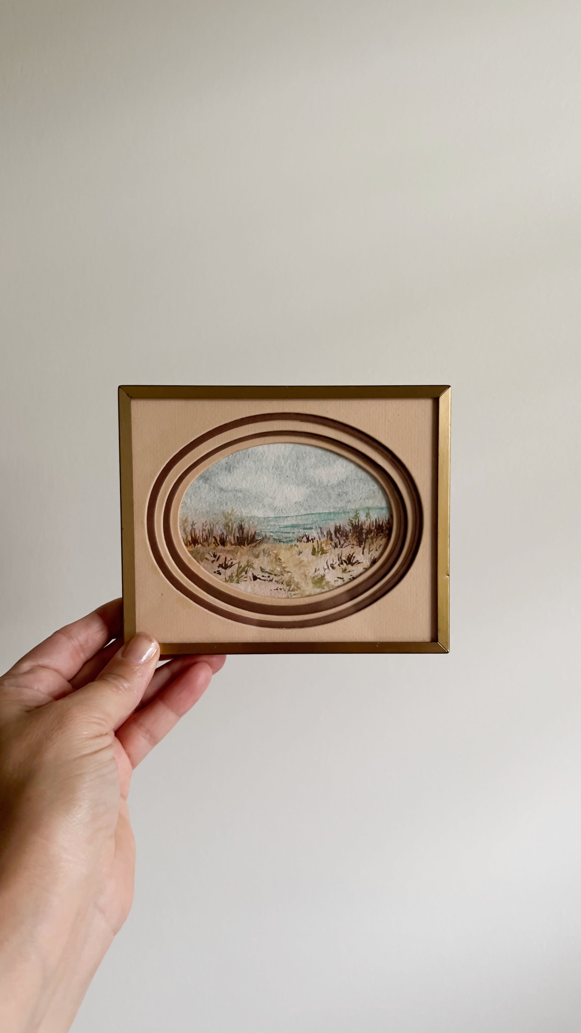 One of a kind gold vintage frame with an oval mat of five layers! Original hand-painted artwork that captures the serene essence of the beach. Comes with easel backing and a small round wall hanging option.