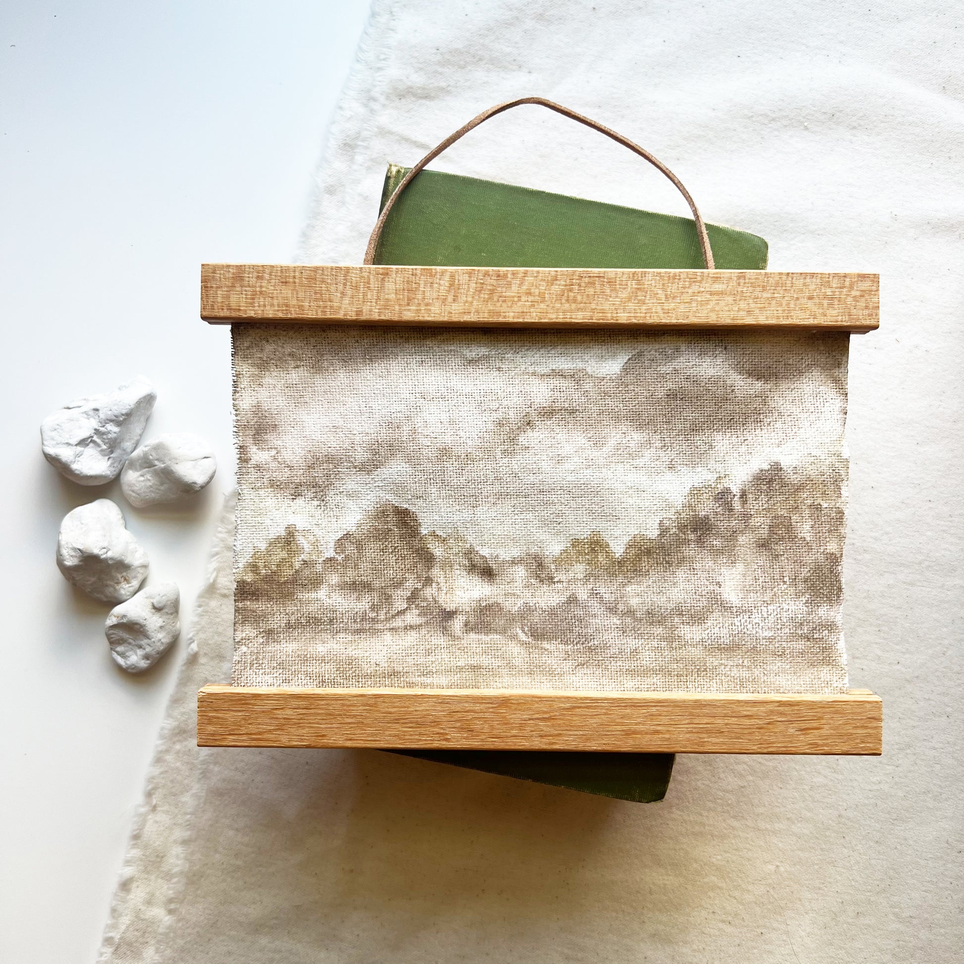 This unique piece is hung with a magnetic wood frame for a modern look. Framing my original soft monotone rustic landscape painting on canvas.