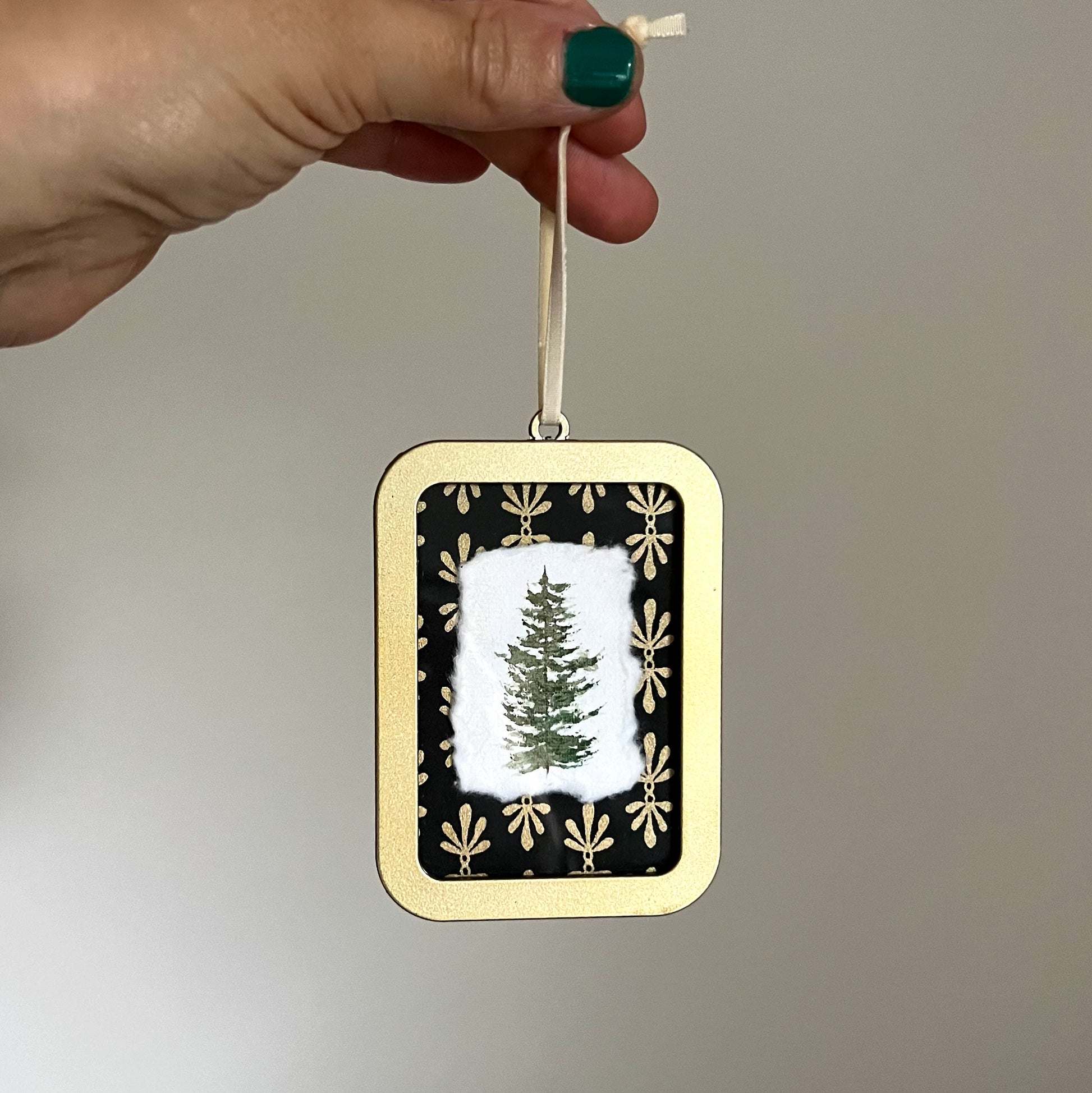 This beautiful ornament is hand painted showcasing a mini hand torn edge evergreen tree with vintage style wallpaper behind glass in a gold metal frame. Signed and ready to hang! Includes a gift bag for easy gifting or storing for yourself.