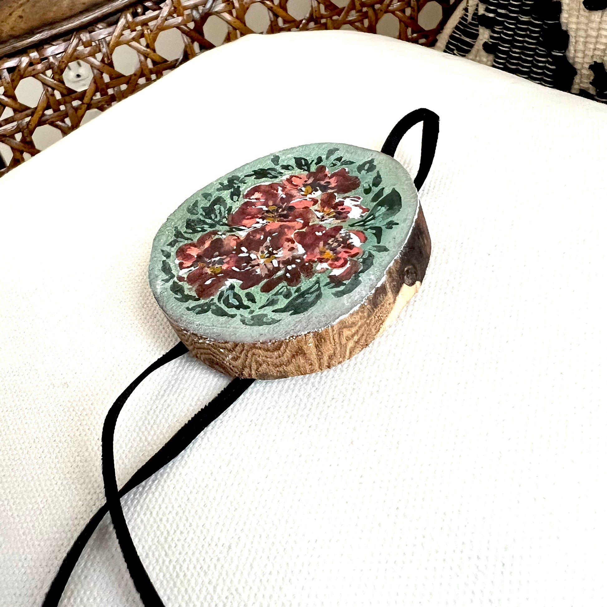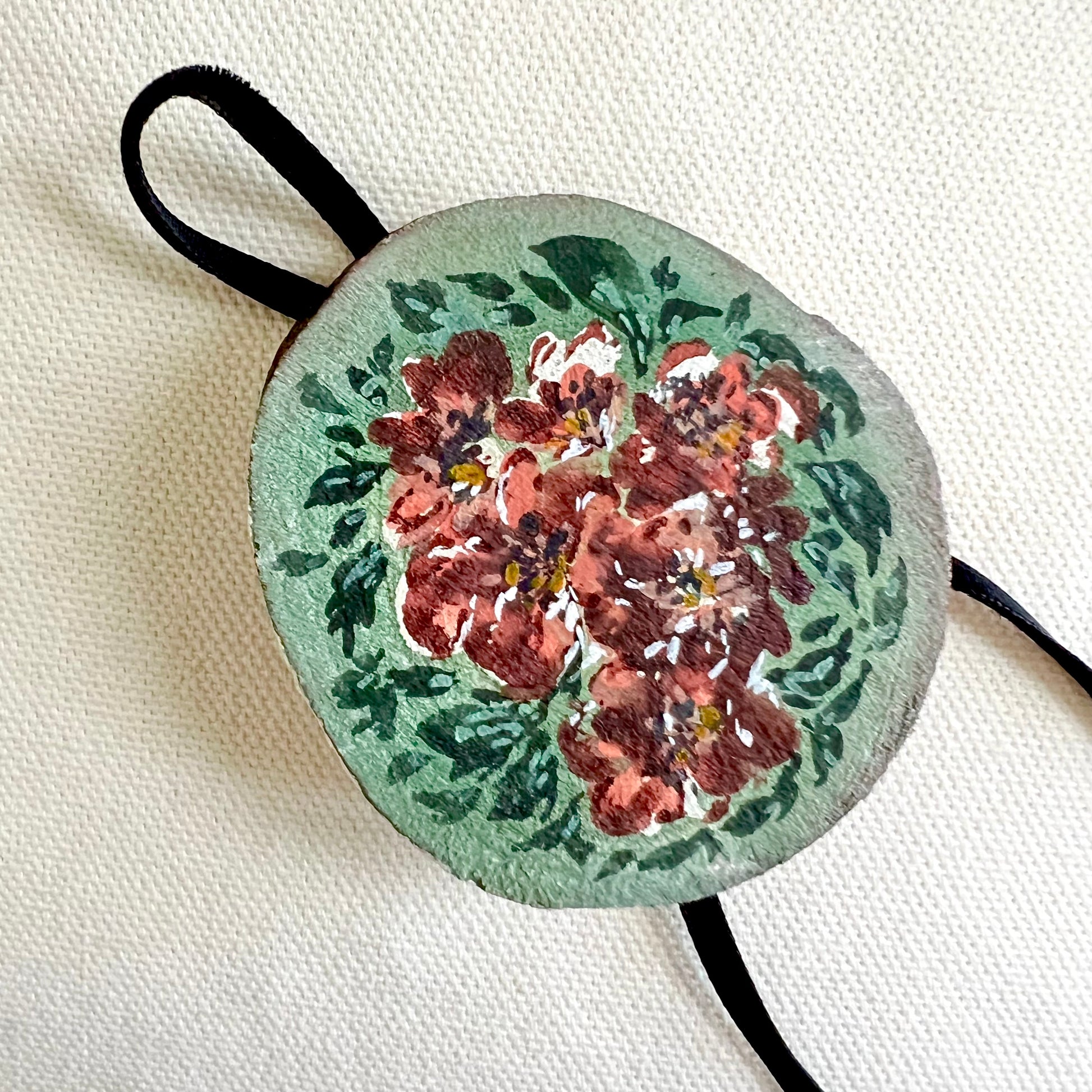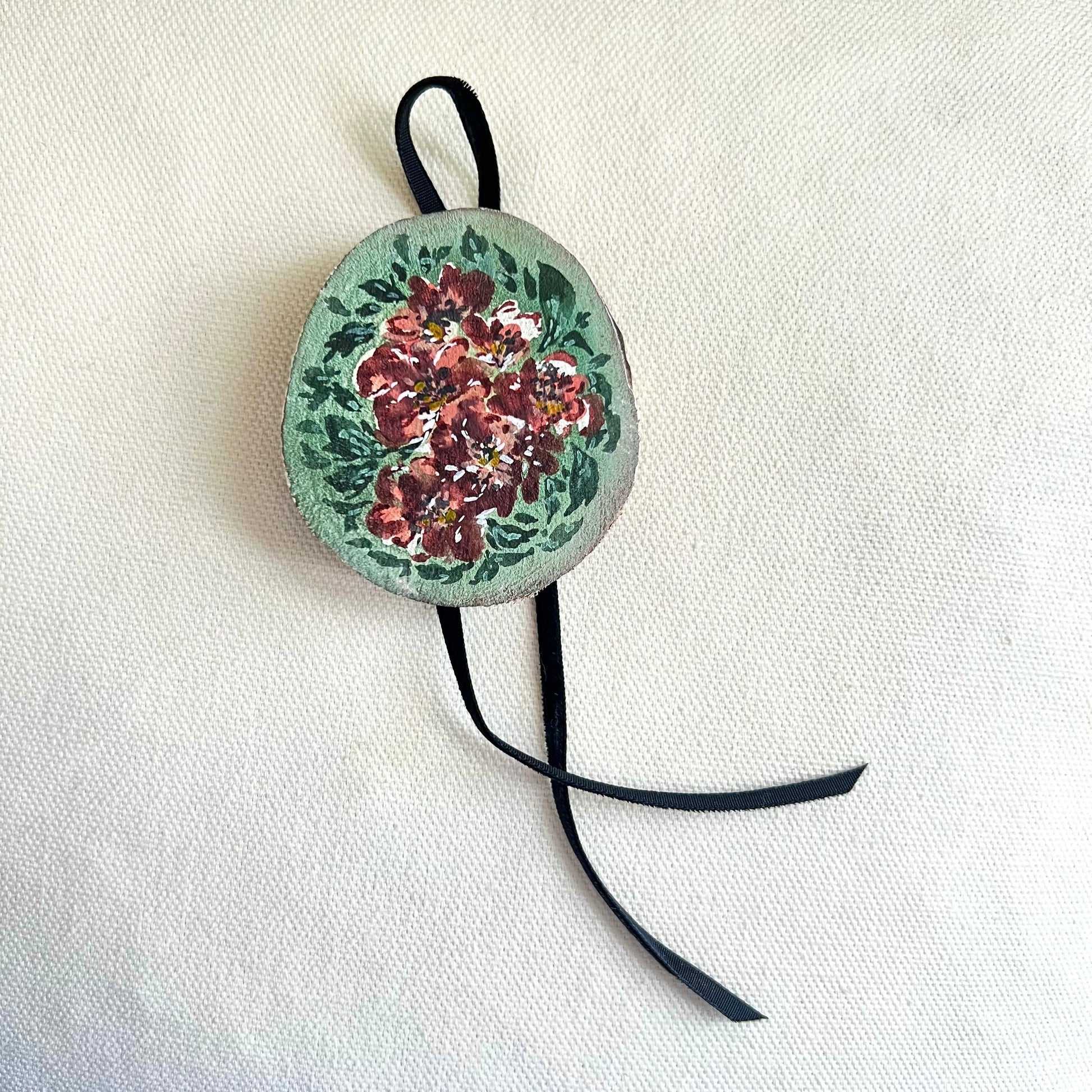 This beautiful ornament is one of a kind, hand painted on wood with a vintage style velvet ribbon! Signed and ready to hang! Includes a gift bag for easy gifting or storing for yourself.