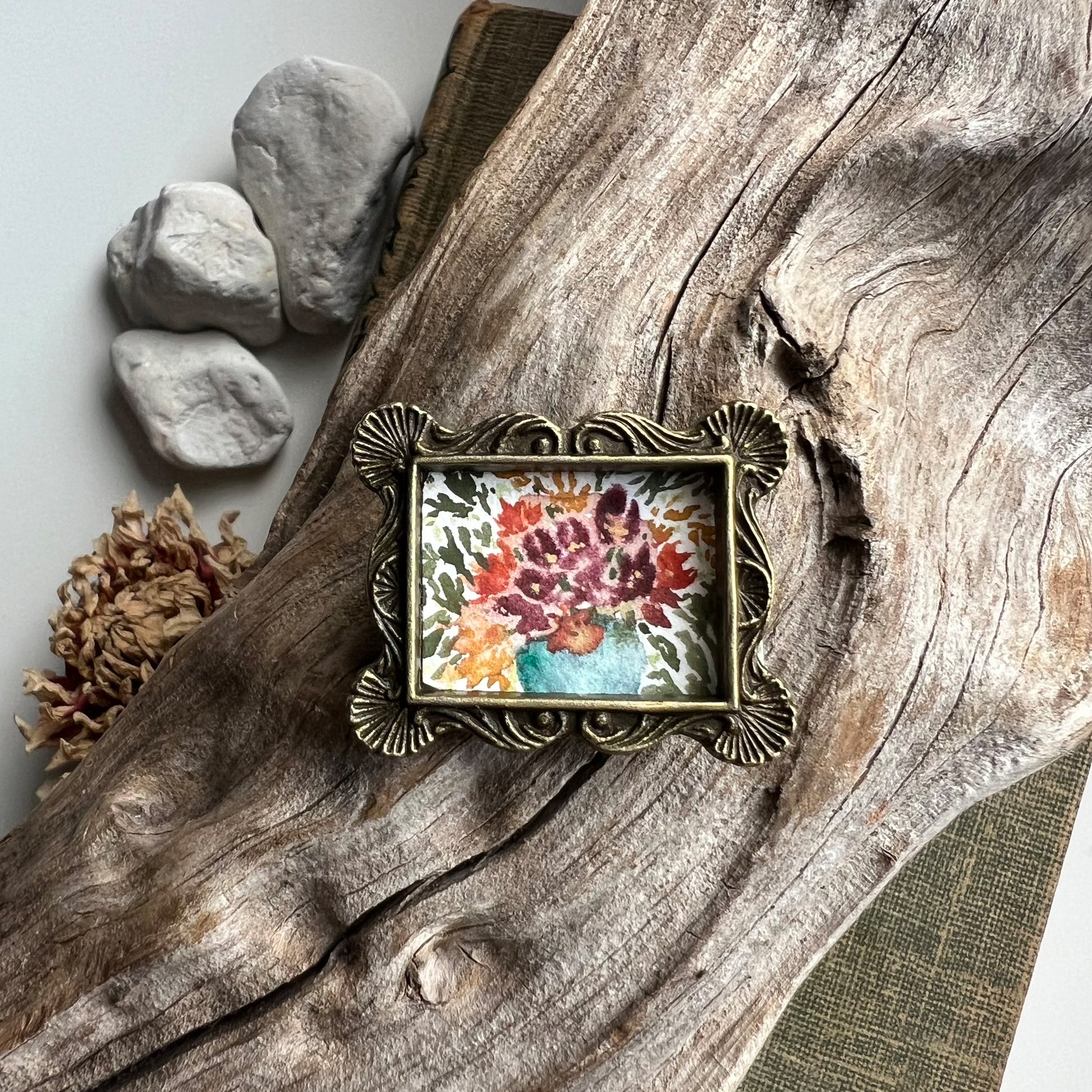 Details: Size: 1.25x1.5 frame; Hand painted watercolor on watercolor paper. Solid brass metal frame with an arm that flips out to stand on a shelf, desk, or nightstand to display. Gift bag and storage bag included.