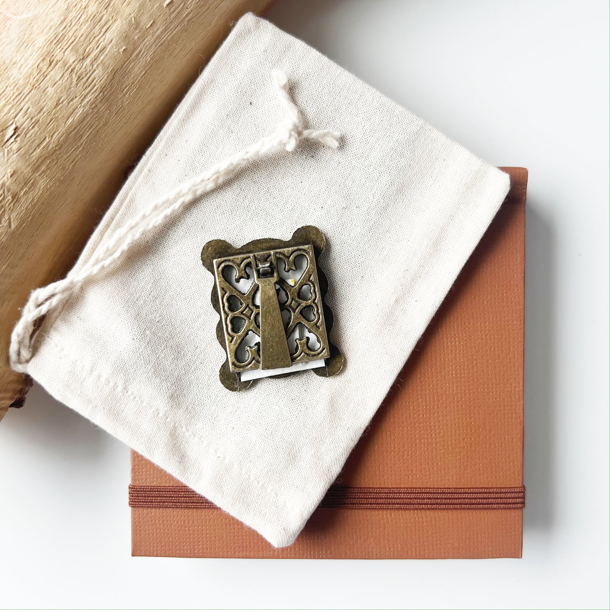 Details: Size: 1.25x1.5 frame; Hand painted watercolor on watercolor paper. Solid brass metal frame with an arm that flips out to stand on a shelf, desk, or nightstand to display. Gift bag and storage bag included.