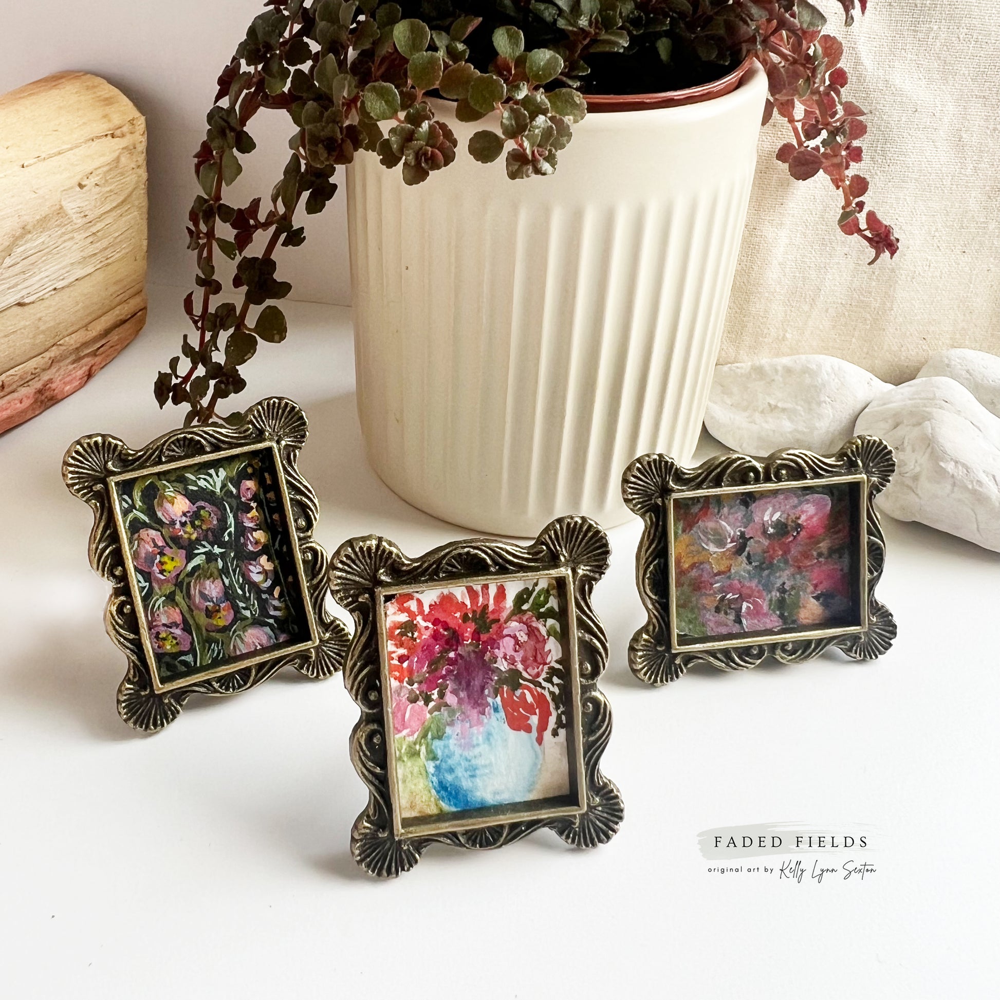 Details: Size: 1.25x1.5 frame; Hand painted watercolor on watercolor paper. Solid brass metal frame with an arm that flips out to stand on a shelf, desk, or nightstand to display. Gift bag and storage bag included.