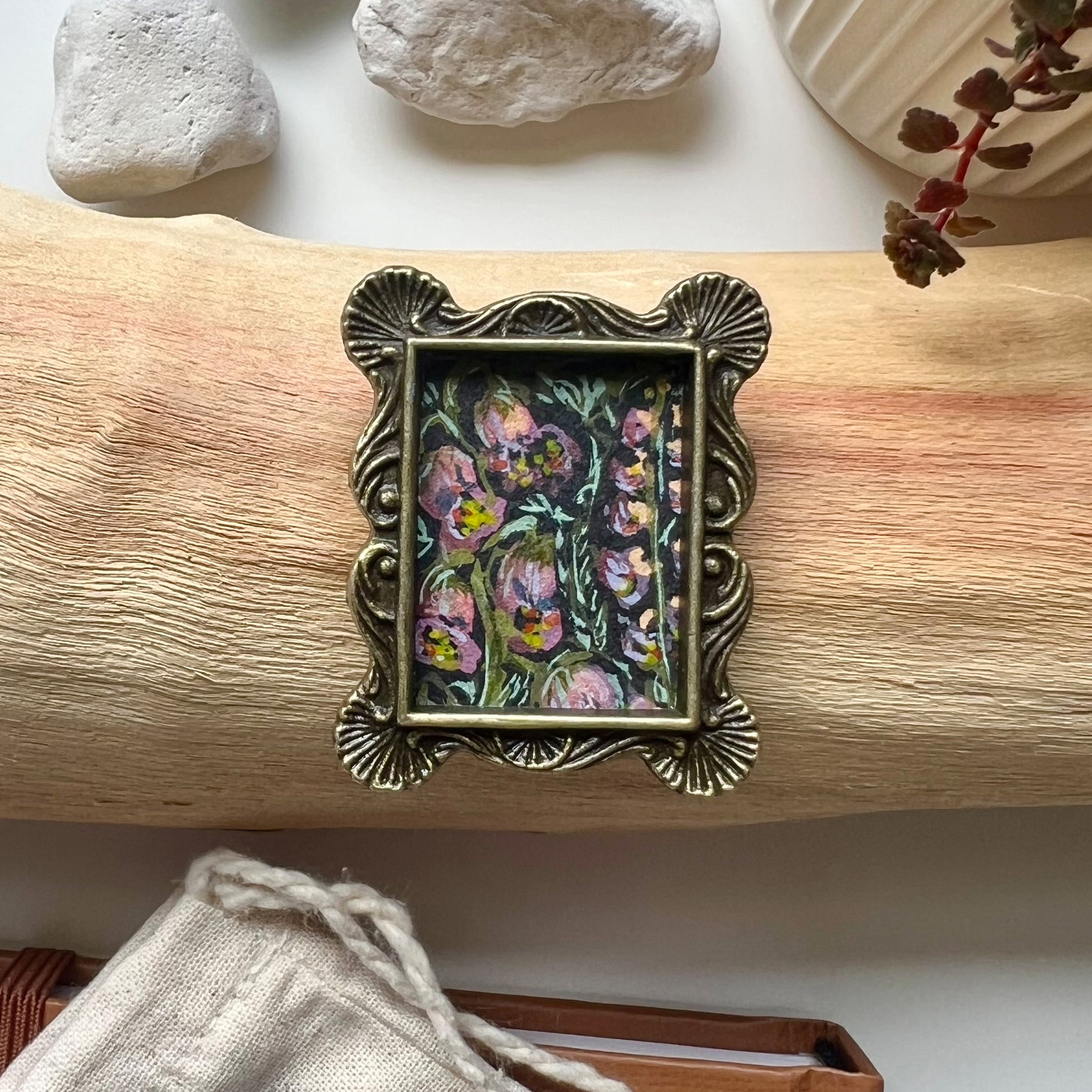 Details: Size: 1.25x1.5 frame; Hand painted watercolor on watercolor paper. Solid brass metal frame with an arm that flips out to stand on a shelf, desk, or nightstand to display. Gift bag and storage bag included.