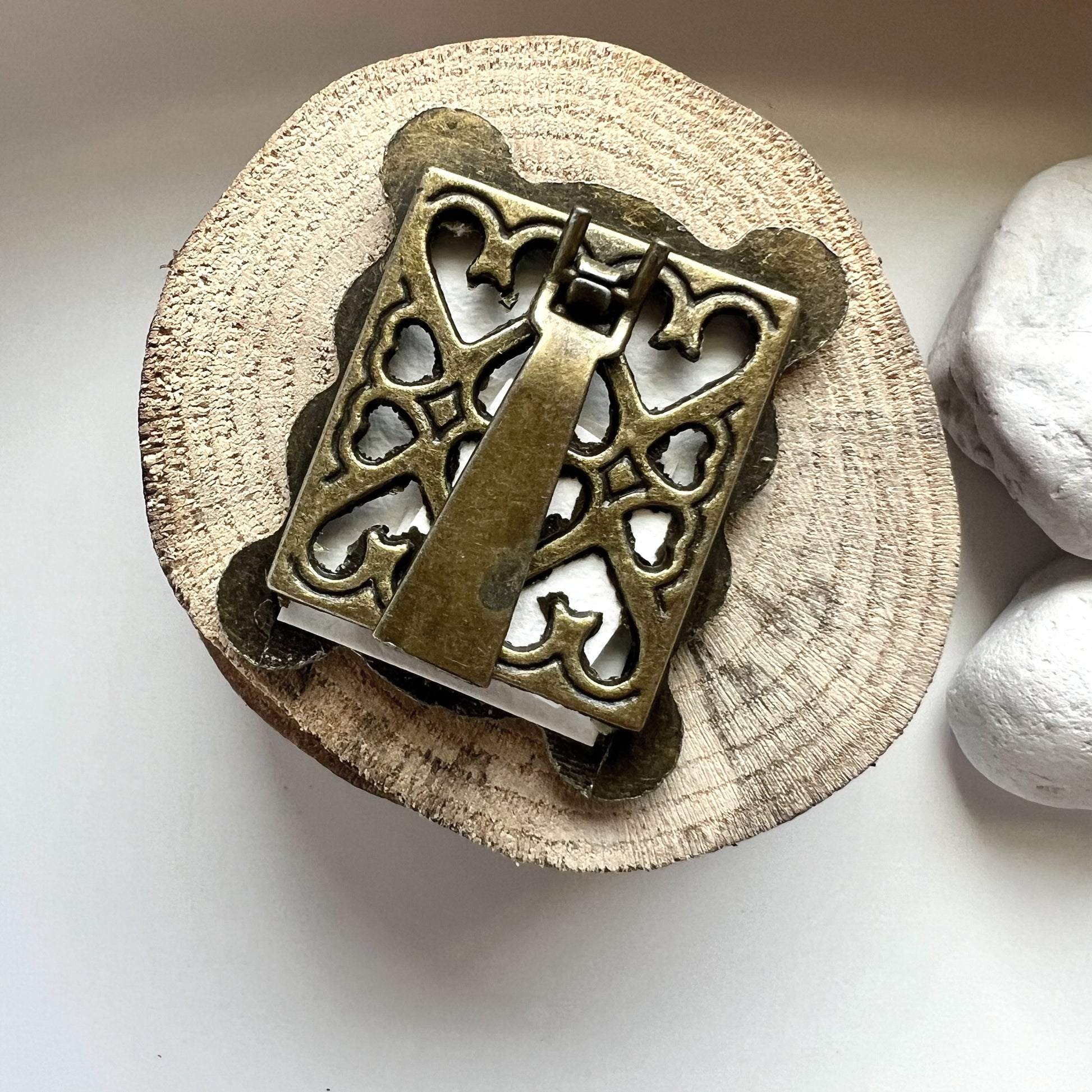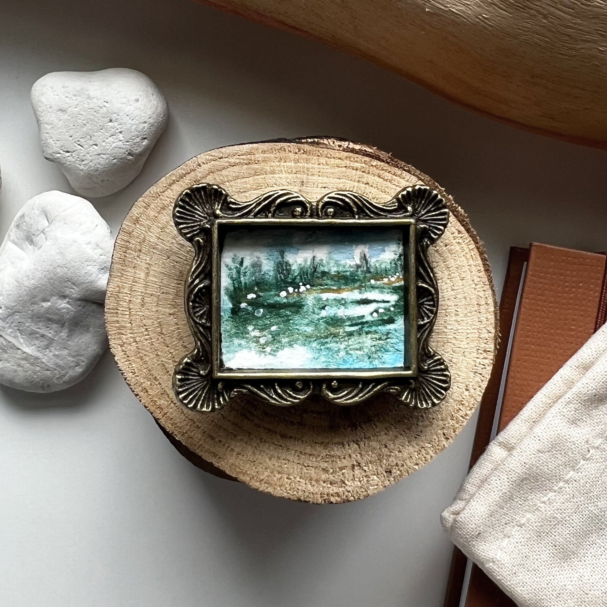 Details: Size: 1.25x1.5 frame; Hand painted watercolor on watercolor paper. Solid brass metal frame with an arm that flips out to stand on a shelf, desk, or nightstand to display. Gift bag and storage bag included.