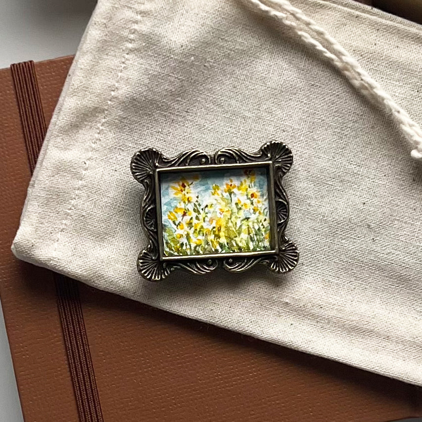 Details: Size: 1.25x1.5 frame; Hand painted watercolor on watercolor paper. Solid brass metal frame with an arm that flips out to stand on a shelf, desk, or nightstand to display. Gift bag and storage bag included.