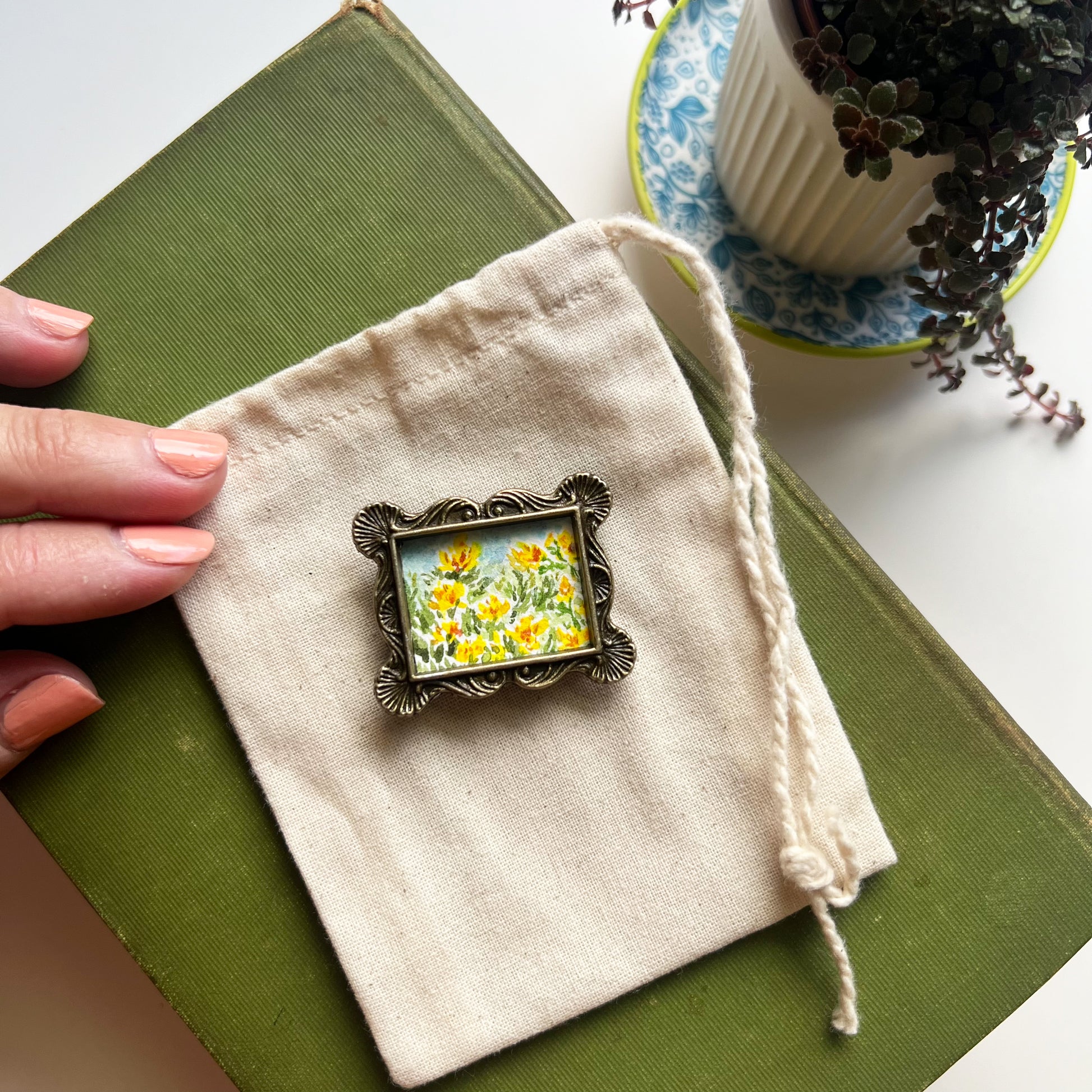 Details: Size: 1.25x1.5 frame; Hand painted watercolor on watercolor paper. Solid brass metal frame with an arm that flips out to stand on a shelf, desk, or nightstand to display. Gift bag and storage bag included.