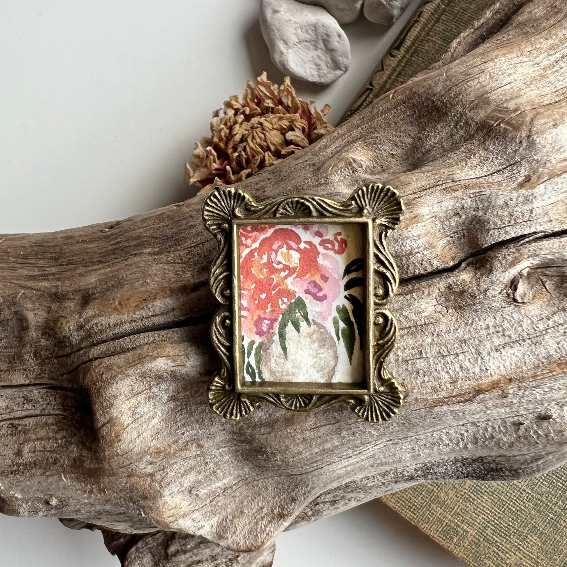 Details: Size: 1.25x1.5 frame; Hand painted watercolor on watercolor paper. Solid brass metal frame with an arm that flips out to stand on a shelf, desk, or nightstand to display. Gift bag and storage bag included.